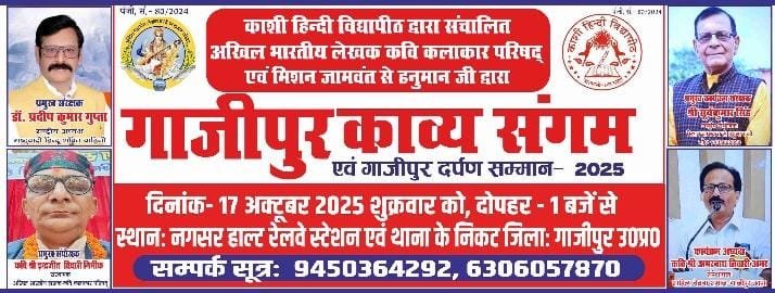 गाजीपुर। नगसर हाल्ट रेलवे स्टेशन स्थित जगजीवन राम इण्टर कालेज में प्रख्यात साहित्यकार डॉ. विवेकी राय एवं स्व चन्द्रदेव शर्मा निशेष जी के स्मृति में गाजीपुर काव्य संगम एवं गाजीपुर दर्पण सम्मान समारोह- 17 अक्टूबर 2025, शुक्रवार को दोपहर -1 बजे से, जगजीवन राम इण्टर कालेज, नगसर हाल्ट रेलवे स्टेशन एवं थाना के निकट, जिला – गाजीपुर, उत्तर प्रदेश में काशी हिन्दी विद्यापीठ द्वारा संचालित अखिल भारतीय लेखक कवि कलाकार परिषद् के संस्थापक कवि इन्द्रजीत तिवारी निर्भीक के प्रमुख संयोजन एवं मिशन जामवंत से हनुमानजी के राष्ट्रीय राष्ट्रीय संयोजक सूर्य कुमार सिंह के प्रमुख संरक्षण में दोनों संस्थाओं के संयुक्त तत्वावधान में साहित्य चेतना समाज के संस्थापक कवि अमरनाथ तिवारी अमर के अध्यक्षता में कवि इन्द्रजीत तिवारी निर्भीक एवं कवि कुमार प्रवीण के संचालन में होगा।