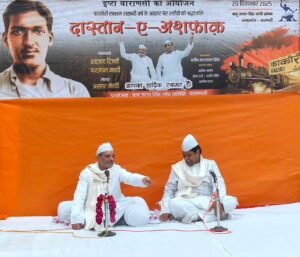 वाराणसी। शनिवार को इप्टा ( भारतीय जन नाट्य संघ ) वाराणसी द्वारा जगतगंज कोठी में दस्तान-ए-अशफाक किस्सागोई के अंतर्गत शहजाद रिजवी एवं फरजाना मेहदी द्वारा लखनऊ के काकोरी कांड की दास्तान श्रोताओं के समक्ष प्रस्तुत की गई, जिसमें क्रांतिकारी अशफाक उल्ला खान के बारे में विस्तार से बताया गया। काकोरी कांड भारतीय स्वतंत्रता संग्राम का एक साहसिक और ऐतिहासिक अध्याय है ,जिसमें अशफाक उल्ला खान का नाम स्वर्णाक्षरों में दर्ज है। वह राम प्रसाद बिस्मिल के घनिष्ठ मित्र थे और हिंदू मुस्लिम एकता के सजीव प्रतीक भी। 9 अगस्त 1925 को ट्रेन से जा रहे अंग्रेजी खजाने को क्रांतिकारियों ने लूटा था । बाद में अशफ़ाक उल्ला को इस केस के अंतर्गत फांसी की सजा हुई थी। कार्यक्रम आयोजक प्रदीप नारायण सिंह, बाबू जगत सिंह, शोध समिति के संरक्षक ने इस कार्यक्रम के कलाकारों और संयोजक सलीम राजा तथा सहसंयोजक अशोक आनंद को साधुवाद दिया। डॉ राम सुधार सिंह ने धन्यवाद ज्ञापन करते हुए बताया मुझे अशफ़ाक उल्ला खान के मजार पर जाने का सौभाग्य प्राप्त हुआ है। यह पूरी किस्सागोई हिंदू मुस्लिम एकता का एक जबरदस्त उदाहरण है।संचालन डॉ(मेजर)अरविंद कुमार सिंह ने किया। इस अवसर पर डॉ हामिद आफाक कुरैशी, अवनिधर, आनंद तिवारी, डॉ मुक्ता, रामानंद दीक्षित, प्रोफेसर अनुराधा बनर्जी एवं हशम तुराबी उपस्थित रहे।