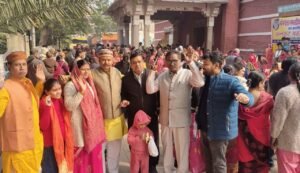 वाराणसी। मां मंगला गौरी गभस्तीश्वर सेवा समिति द्वारा प्रतिवर्ष की भर्ती इस वर्ष भी शिव पंचायतन अन्नकूट महोत्सव के अवसर पर शुक्रवार को टाउनहाल से भव्य मंगल कलश शोभा यात्रा निकाली गयी। टाउन हॉल मैदान मे समाजसेवी रवि सर्राफ, कमल कुमार सिंह, राजू वर्मा बिछिया वाले तथा अन्य द्वारा कन्याओं का पूजन से शोभा यात्रा आरंभ हुई। शोभायात्रा टाउन हॉल से उठकर मैदागिन, बुलानाला, नीचीबाग, चौक पर रवि सर्राफ के नेतृत्व में स्वर्णकार बंधुओ ने शोभायात्रा पर पुष्प वर्षा एवं आरती कर भव्य स्वागत किया। चौक से ठठेरी बाजार, चौखम्बा होते हुए मंगला गौरी मंदिर पहुंचकर समाप्त हुई। समिति के अध्यक्ष नरेंद्र कुमार पांडे ने बताया कि आज अन्नकूट महोत्सव के अवसर पर 131 कुँवारी कन्याओं का विधीवत पूजन के तत्पश्चात भव्य शोभायात्रा टाउनहाँल से मां की विग्रह रथ पर सवार, गाजे-बाजे के साथ डमरू दल तथा महिलाएं हाथों में मंगल कलश लिए हुए माता की जयकारे और हर हर महादेव के उदघोष के साथ चल रही थी जो पंचगंगा घाट स्थित मंगला गौरी के मंदिर परिसर पहुंचकर समाप्त होगी, जहां सायंकाल मां मंगला गौरी, बाबा गभस्तीश्वर महादेव सहित अन्य सभी विग्रहों का सुगंधित फूल-मालाओं से भव्य श्रृंगार, भोग, हवन-पूजन एवं महाआरती होगी। सायंकाल से आयोजित भंडारे मे श्रद्धालुओं को प्रसाद वितरण किया जायेगा। शोभा यात्रा में मुख्य रूप से मंहत पंडित नारायण गुरु, नरेंद्र कुमार पांडे, तरुण पांडे, मयंक पांडे, पंडित चुन्नू गुरु, रवि सराफ, कमल कुमार सिंह, श्याम सुंदर सिंह, बच्चू राम सेठ, राजू वर्मा बिछिया वाले, श्याम सुंदर सिंह, आशीष सोनी, हनी सिंह सहित सैकड़ो महिलाएं, बच्चे एवं श्रदालुजन शामिल थे।