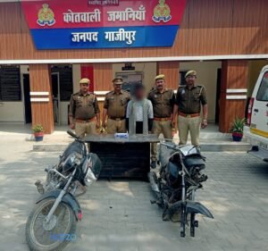 थाना जमानिया पुलिस टीम ने 1वांछित अभियुक्त को 2 चोरी की मोटर साईकिल, 1 अदद देशी तमंचा .315 बोर व 01 अदद जिन्दा कारतूस .315 बोर के साथ किया गिरफ्तार* ।