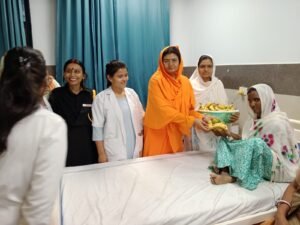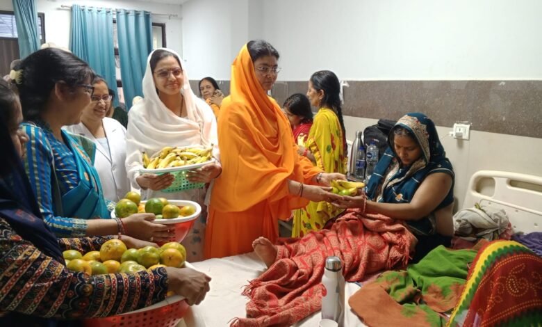 *मानव उत्थान सेवा समिति श्री हंस योग आश्रम के तत्वावधान मातृ दिवस पर महाराज सतपाल जी की माता श्री राजराजेश्वरी देवी के जन्मोत्सव पर जिला महिला अस्पताल की डॉक्टर ममता सिंह व महात्मा दयावती बाई जी के नेतृत्व में मरीजों को फल वितरण*।* **सेवा से ही व्यक्ति महान बनता है —दयावती बाई। *गुरु दरबार की सेवा कभी भी विफल नहीं —-ठाकुर दास बाबा*