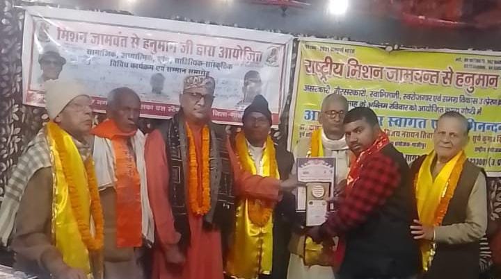 विशेष मानद अभिनन्दन काव्य-कला संगम में विक्रमशिला हिन्दी विद्यापीठ द्वारा डाक्ट्रेट मानद उपाधि समकक्ष हिन्दी साहित्य शिरोमणि एवं विद्या वाचस्पति मानद सम्मान प्राप्त लोगों का मिशन जामवंत से हनुमान जी द्वारा किया गया नागरिक अभिनंदन -*