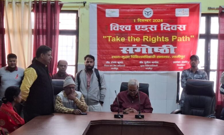 शासन के निर्देश के क्रम में जनपद गाजीपुर में विश्व एड्स दिवस के अवसर पर जागरूकता कार्यक्रम एवं प्रतियोगिता का आयोजन मुख्य चिकित्सा अधिकारी महोदय के निर्देश के क्रम में किया गया लूदर्स कान्वेंट बालिका इंटर कॉलेज गाज़ीपुर में जागरूकता एवं प्रतियोगिता गत3दिसम्बर आयोजित किया गया।इस कार्यक्रम में विद्यालयए के छात्राओ ने प्रतिभाग किया जिस में तीन छात्रा स्लोगन एवं तीन छात्रा पोस्ट पेन्टीग में प्रथम द्वितीय एवं तृतीय स्थान प्राप्त किया।इस के उपरान्त प्राचार्य महोदया द्वारा सभी विजेता छात्राओं को पुरस्कृत किया गया। स्वास्थ्य विभाग द्वारा प्रधानाचार्य महोदया को स्मृति चिन्ह भेंट किया गया।।इस के उपरान्त मेडिकल कॉलेज के ओ पी डी ब्लाक से मुख्य चिकित्साधिकारी महोदय द्वारा झंडी दिखाकर जागरूकता रैली को रवाना किया।इस के उपरान्त मुख्य चिकित्साधिकारी महोदय गाज़ीपुर द्वारा हस्ताक्षर कर हस्ताक्षर अभियान का शुभारम्भ किया गया इसके बाद सभी अधिकारी एवं कर्मचारी ने हस्ताक्षर किया।इस बाद मुख्य चिकित्साधिकारी महोदय गाज़ीपुर के सभागार कक्ष में मुख्य चिकित्साधिकारी महोदय गाज़ीपुर डाक्टर सुनील पाण्डेय के अध्यक्षता में संगोष्ठी का आयोजन किया गया। मुख्य चिकित्सा अधिकारी महोदय गाजीपुर द्वारा संदेश दिया गया की जागरूकता और जानकारी ही एड्स और एच आई वी से ही बचा जा सकता है। जिसके लिए पूरे जनपद में स्वास्थ्य विभाग के कर्मचारियों द्वारा जागरूकता कार्यक्रम स्कूल एक्टिविटी गांव में सभा लगाकर लोगों को जागरुक किए जाने का कार्य किया जा रहा है।इस कार्यक्रम में सहयोगी संस्था टी आई, ज्योति ग्रामीण संस्था,संयम उपस्थित थे इस कार्यक्रम में ए सी एम ओ डाक्टर मनोज कुमार सिंह, डाक्टर सुजीत मिश्रा, डाक्टर गुलाब जिला क्षयरोग अधिकारी डाक्टर संजय कुमार, जिला कार्यक्रम समन्वयक डाक्टर मिथिलेश कुमार सिंह,पी पी एम अनुराग पाण्डेय , संजय यादव, सुनील वर्मा, कमलेश,रवि, काउंसलर अंजू सिंह, निरा राय, सीमा, प्रतिभा, प्रतिमा, संगीता आरती, श्वेता, स्वर्ण लता, श्वेता, कुसुम, आरती सिंह,आज कुमार,बाबी इत्यादि उपस्थित थे।