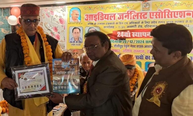 गाजीपुर के हास्य कवि इन्द्रजीत तिवारी निर्भीक को आइडियल जर्नलिस्ट एसोसिएशन द्वारा अतिविशिष्ट रचनाकार सम्मान -2025 वाराणसी महानगर के आशापुर चौराहे के पास स्थित वालिवुड पेईंग गेस्ट हाऊस में आइडियल जर्नलिस्ट एसोसिएशन के 24 वें स्थापना दिवस समारोह में राष्ट्रीय अध्यक्ष डा. प्रमोद वाचस्पति, एवं राष्ट्रीय संयुक्त महामंत्री भूपेन्द्र अग्रहरी ने भेंट किया।